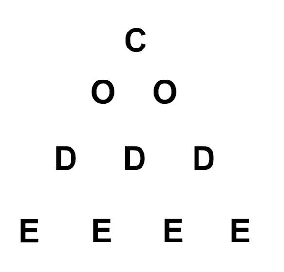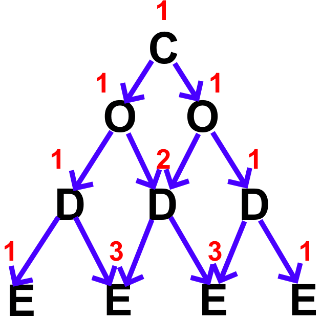 A person starts at the top letter C and moves downward, choosing to step diagonally left or right at each level. How many unique paths spell the word CODE?